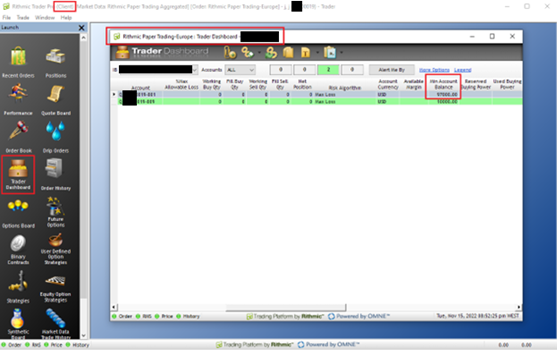 Go to your open Client instance of R | Trader Pro. Click on the “Trader Dashboard” tab in the mid left section. In this window, scroll slightly to the right and you will see the “Min Account Balance” column. This is your current end-of-day trailing drawdown account value. See picture below for reference.